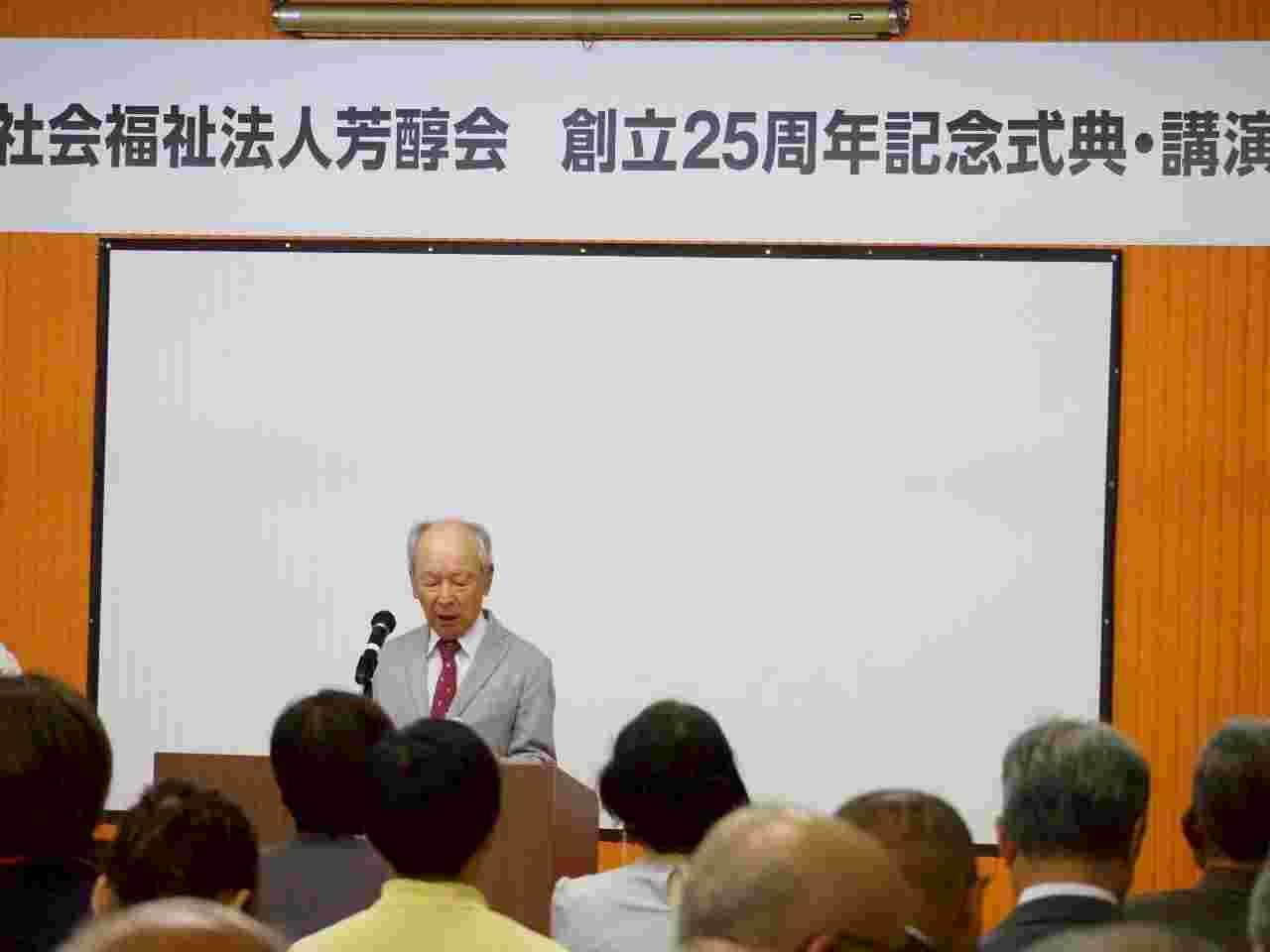 2025年10月16日(木)、浅見市長、竹本市議、柴田自治会長様などのご来賓を招き、社会福祉芳醇会、創立25周年記念式典、講演会を開催しました。式典では、理事長挨拶、浅見市長様にご祝辞を頂戴したのちに、永年勤続者ならびに特別功労者表彰が行われました。また、講演会では社会福祉法人やまなみ会 山下施設長をお招きし「全ては幸せを感じるために~やまなみ物語~」と題してご講演いただきました。